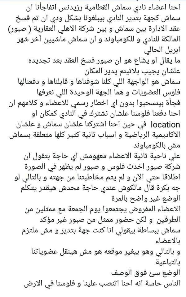 وقال الاعضاء بأنهم عندما تواصلوا مع مسئولى إدارة سماش، واكدوا لهم ان شركة سماش كانت تدير النادى فقط، وان أى إجراء أو معلومات عن مستقبل إشتراكات الاعضاء بالنادى ومصيرهم فى أيدي شركه الأهلى للتنمية العقارية.