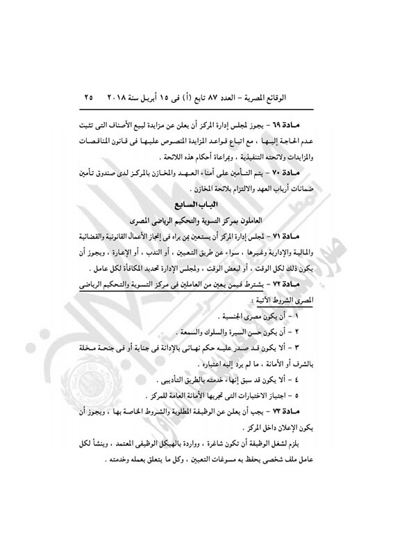 نشرت ملحق “الوقائع المصرية” بالجريدة الرسمية في عددها رقم 87 تابع (أ) الصادر في 15 أبريل 2018، قرار اللجنة الأوليمبية المصرية برئاسة هشام حطب، رقم 3 لسنة 2018، بشأن اللائحة المالية لمركز التسوية والتحكيم الرياضى.