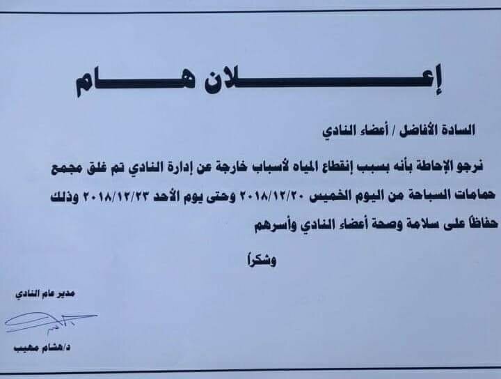 وذكر الاعضاء ان ادارة النادي لم تكشف حقيقة انقطاع المياه عن النادي، وان السبب الحقيقي يعود الى متأخرات النادي لشركة المياة والتى ادت الي قيام الشركة بقطع المياة عن النادي بعد أكثر من إنذار بالدفع ولم يلتزم النادي بسداد م عليه من فواتير متأخرة.