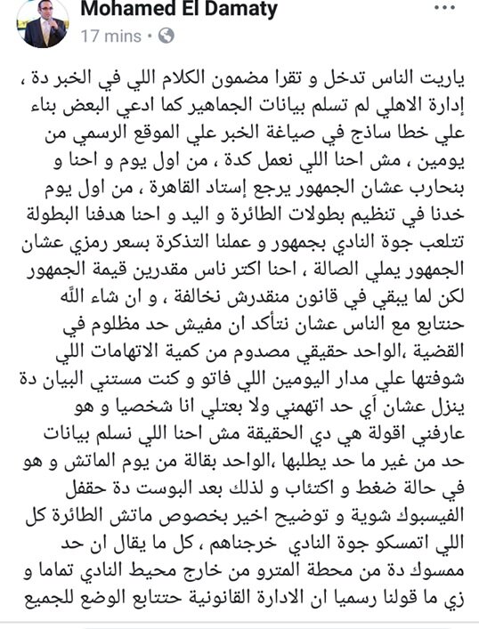 وأصدر أمس النادى الاهلى بيانا ثانيا بشأن الازمة، جاء نصه كالتالى: