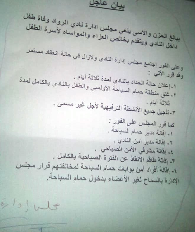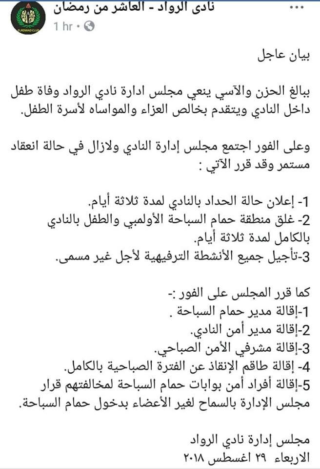 قرر مجلس إدارة نادي الرواد الرياضى بمدينة العاشر من رمضان برئاسة الدكتور أبو الحجاج عبد الغنى، إقاله مدير الأمن وطاقم أنقاذ حمام السباحة، وغلق حمام السباحة على خلفية غرق طفل بحمام السباحة اليوم الأربعاء.