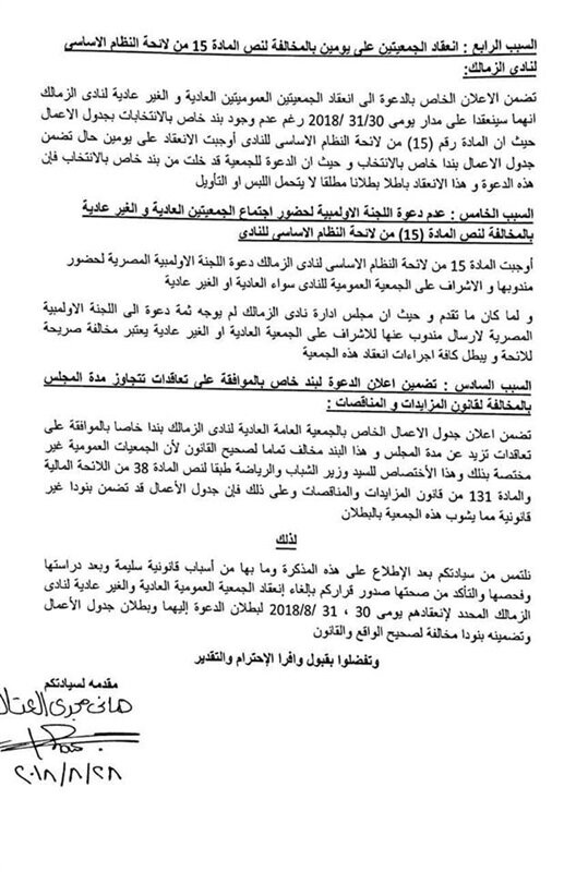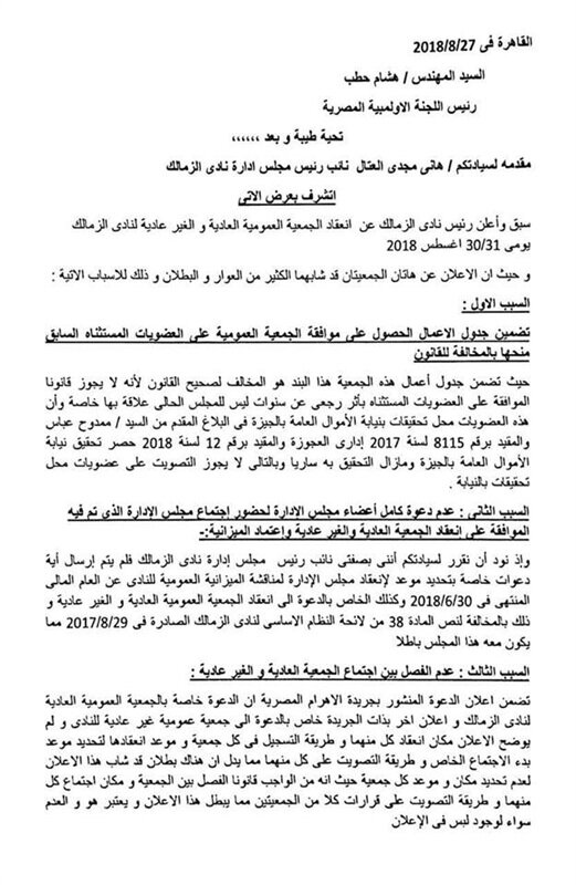 وعلى جانب أخر، تقدم هاني العتال نائب رئيس الزمالك بشكوى للجنة الأوليمبية المصرية يطالب فيها بإلغاء قرار رئيس النادي مرتضى منصور بإجراء جمعيتين عموميتين، عادية وغير عادية يومي 30 و31 أغسطس.