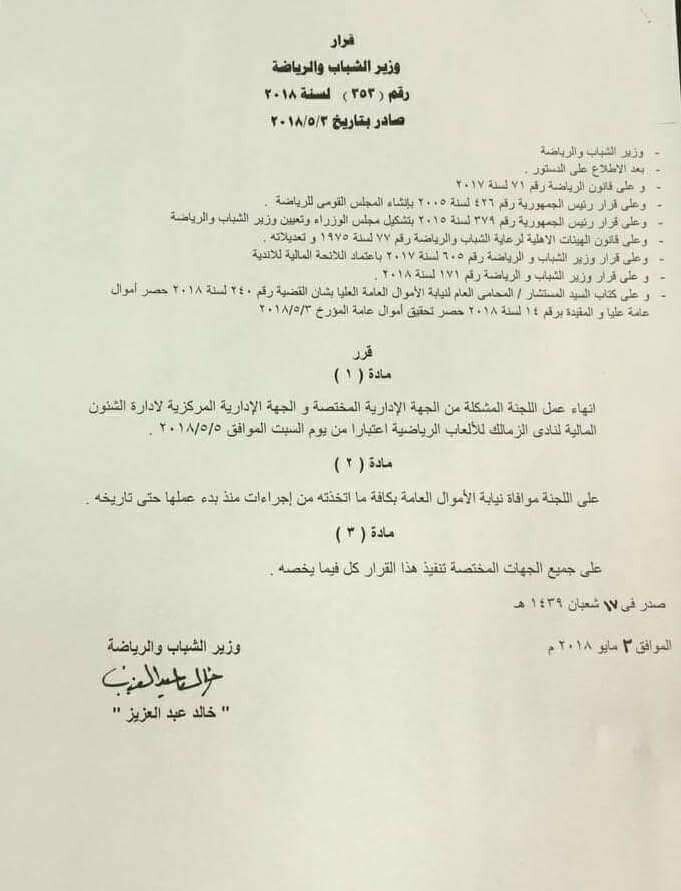 أصدر المهندس خالد عبد العزيز وزير الشباب والرياضة قرار رقم 353 لسنة 2018، بشأن إنهاء عمل اللجنة المالية المشكلة لادارة نادى الزمالك بشكل رسمي.