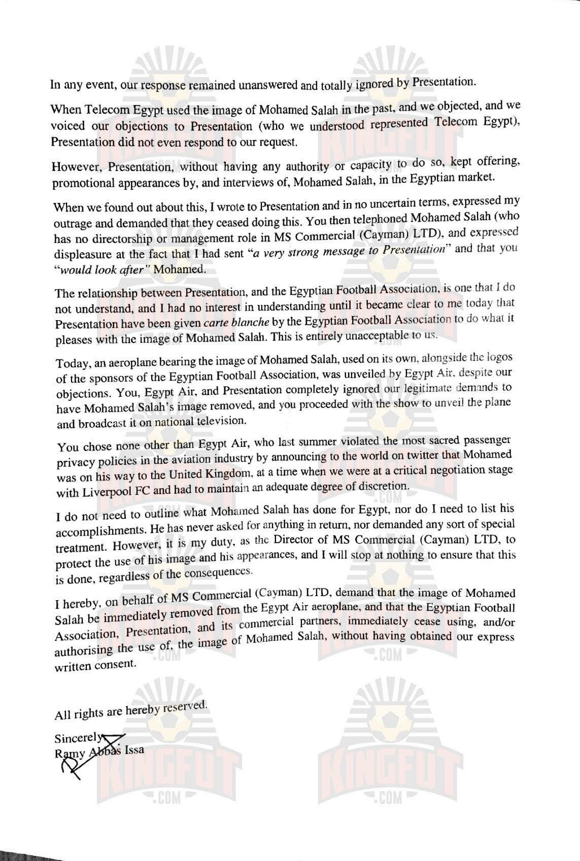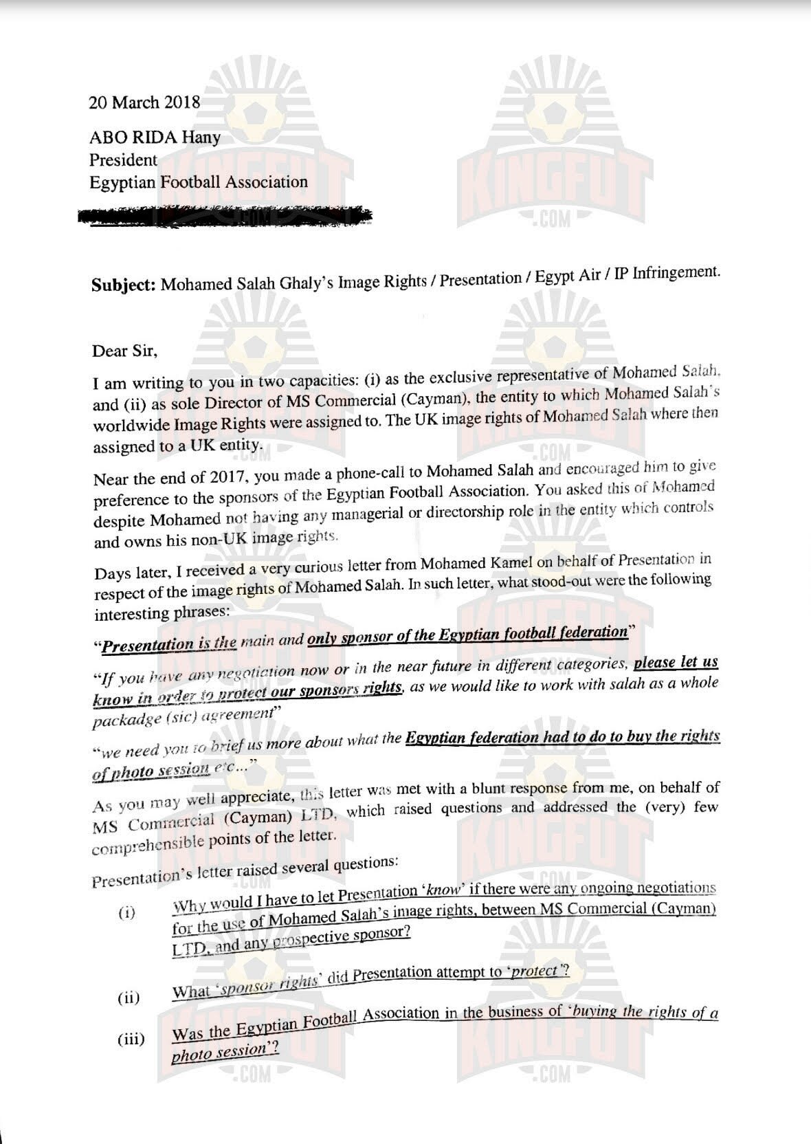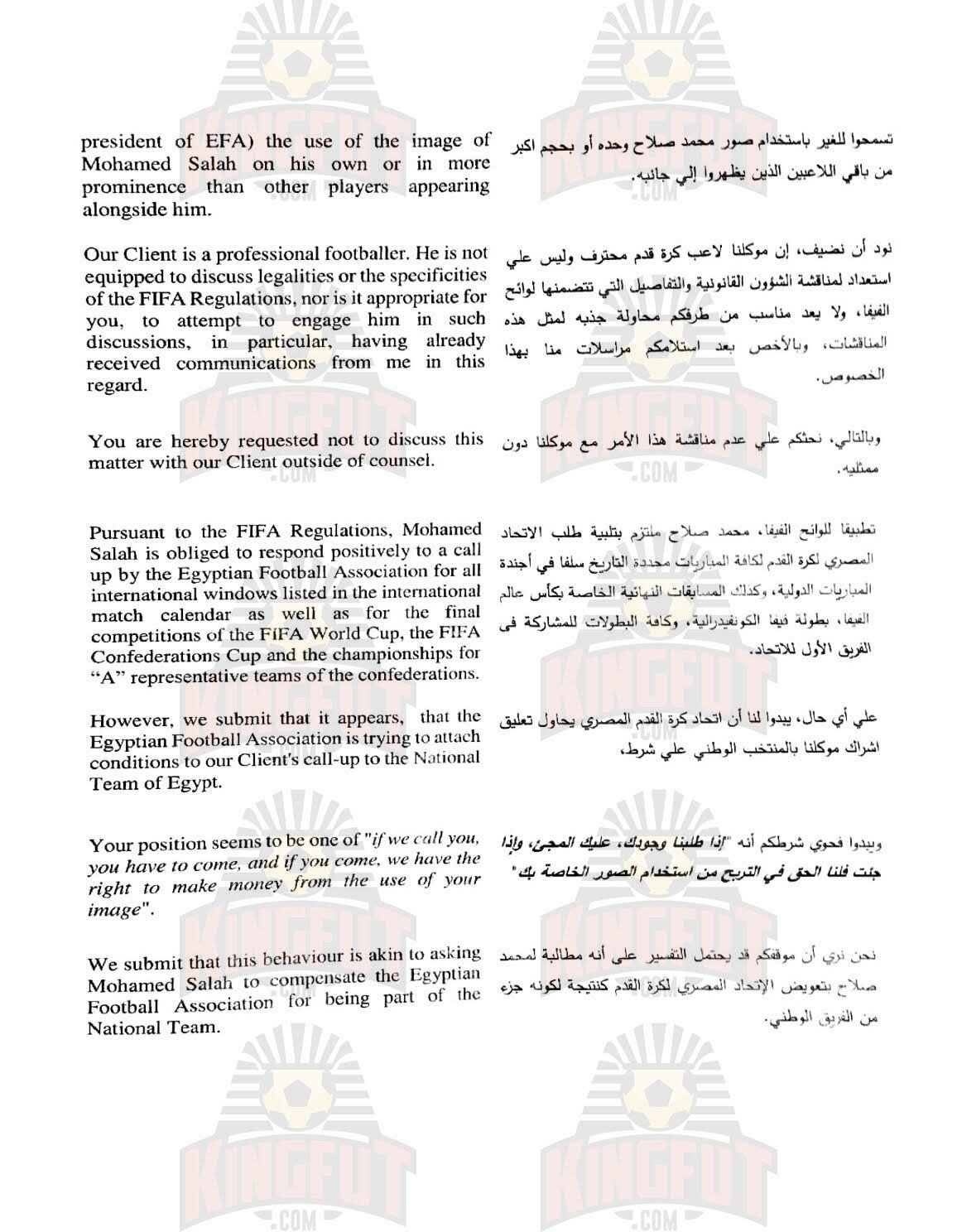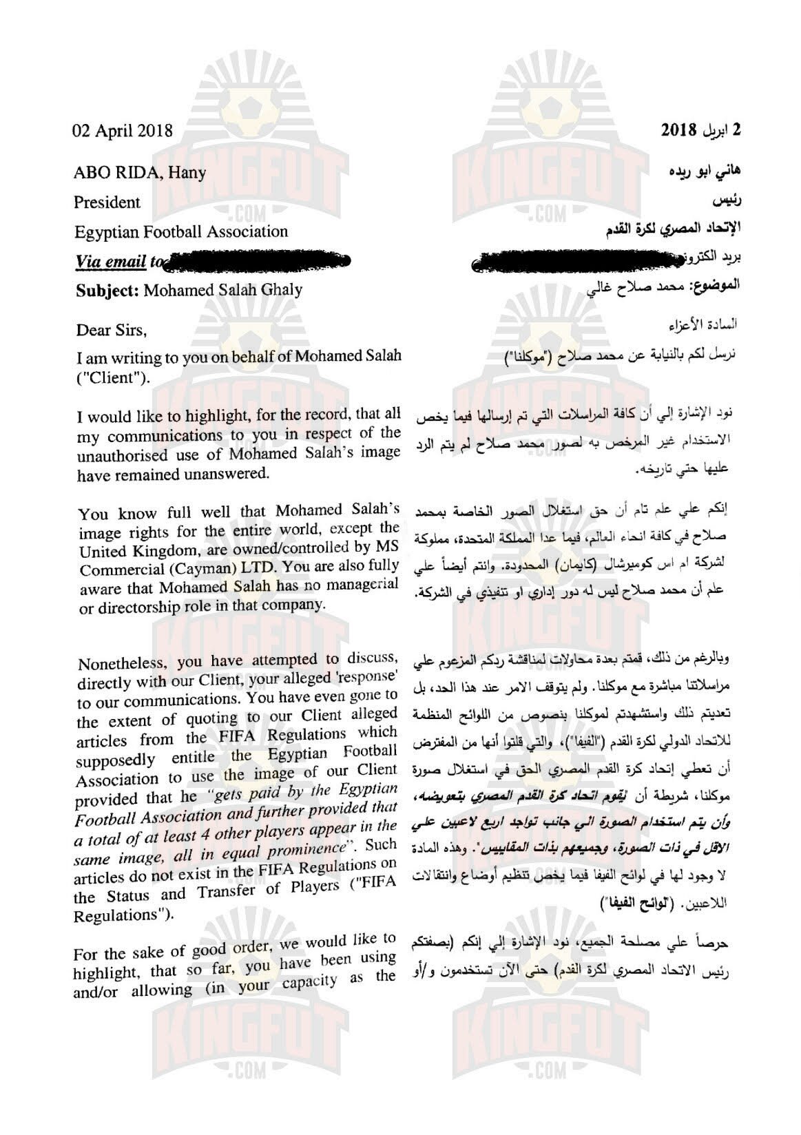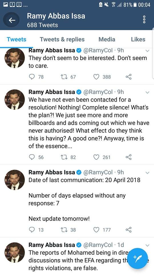 5- تسبب الاتحاد فى عدة أزمات للاعب الدولى محمد صلاح من بينها أزمتين مع الشركة المالكة لحقوقه التسوقية، حين قام الاتحاد بوضع صورة اللاعب على الطائرة الناقلة لمنتخب مصر لكأس العالم بروسيا بجوار شعار شركة اتصالات منافسة للشركة التى تمتلك حقوق تسويق اللاعب وذلك حين لبى اتحاد الكرة دعوة العشاء الموجهة من الرئيس الشيشانى ” رمضان قديروف” والتى على هامشها تم تكريم صلاح ومنحه المواطنة الفخرية مما تسبب فى إثارة الإعلام الإنجليزى ضد اللاعب لوجود خلافات سياسية بين دولة إنجلترا وجمهورية الشيشان.