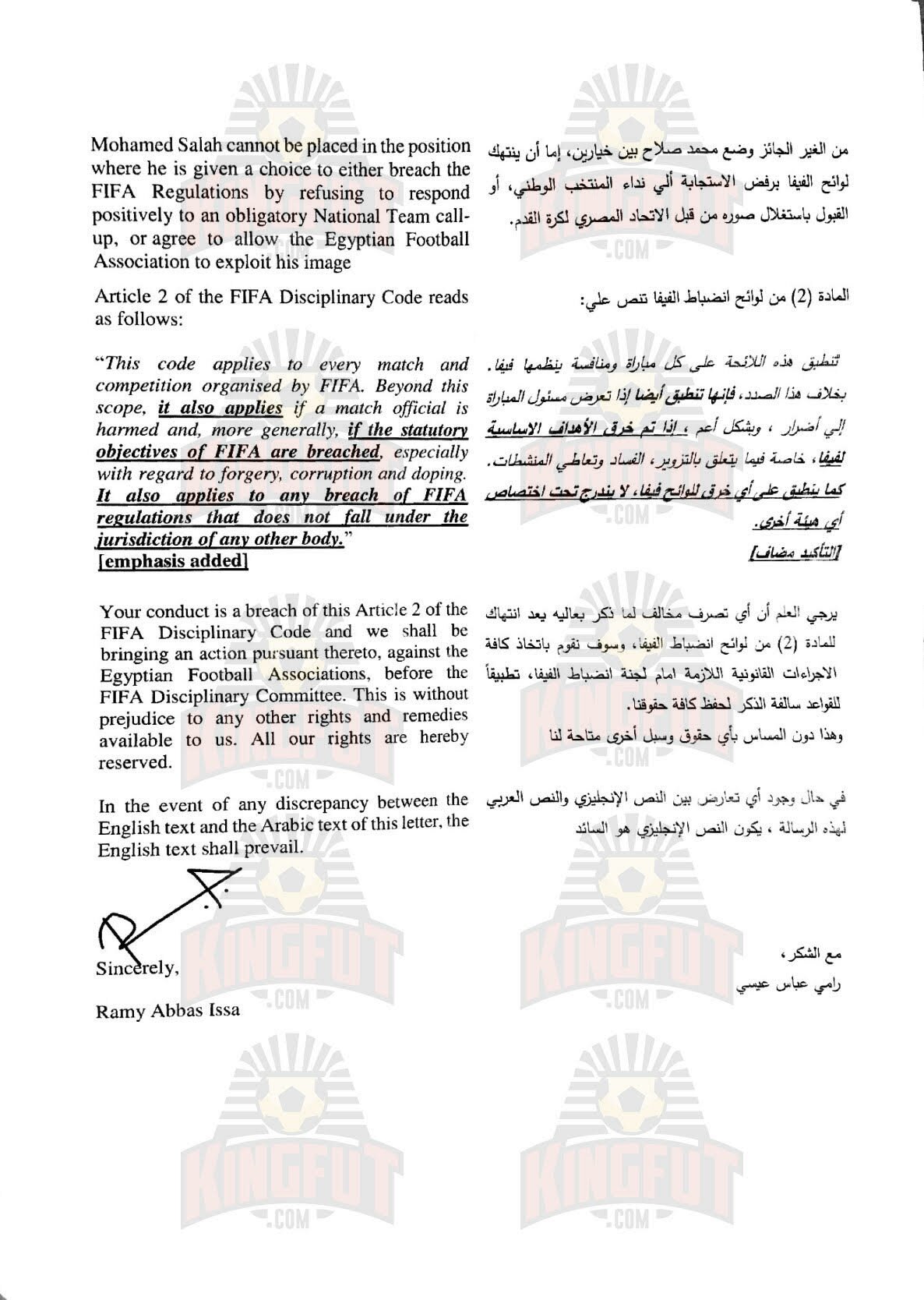 4- عدم الالتزام بالاتفاق الذى تم بين البرلمان واتحاد الكرة بتشكيل لجنة مستقلة من مجلس النواب والرقابة الادارية والأمن الوطنى تتولى مسئولية بيع تذاكر مباريات المنتخب فى كأس العالم للجمهور تحقيقاً للشفافية مما أدى إلى بيع تذاكر المباريات بطرق غير مشروعة.