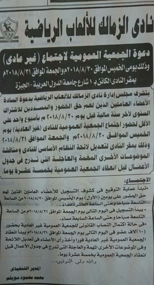 يذكر أن مجلس إدارة نادى الزمالك، برئاسة مرتضى منصور، وجه الدعوة لأعضاء الجمعية العمومية بالنادى لعقد جمعية عمومية غير عادية. وستعقد الجمعية العمومية العادية والغير عادية بمقر النادى يومى الخميس والجمعة 30 و31 من شهر أغسطس الجارى.