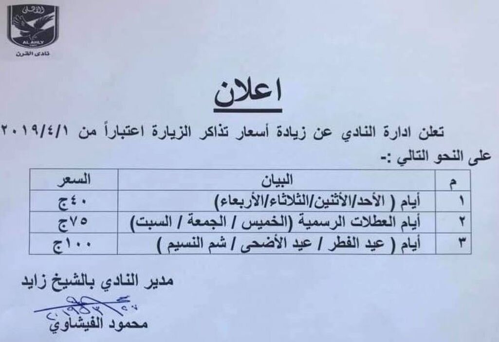 قرر مجلس إدارة النادي الاهلي برئاسة الكابتن محمود الخطيب، زيادة أسعار تذاكر دخول الزائرين من مرافقين الأعضاء بداية من شهر إبريل 2019 لتصبح كالتالي: